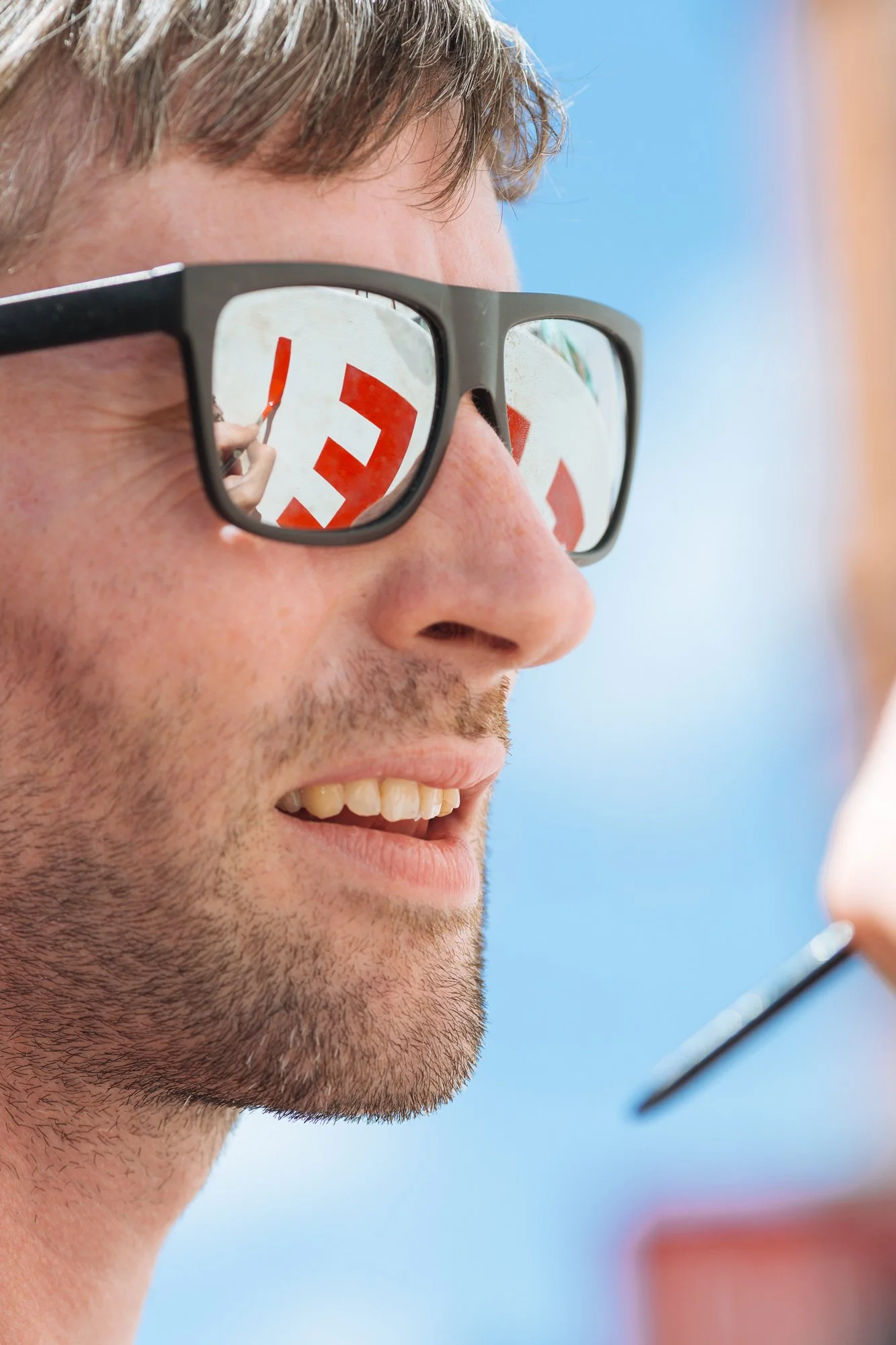 A woman with long dark hair and red lipstick wearing a green fleece jacket, engaged in conversation with a blurred person in the foreground, at an outdoor gathering during the daytime. View fullsize